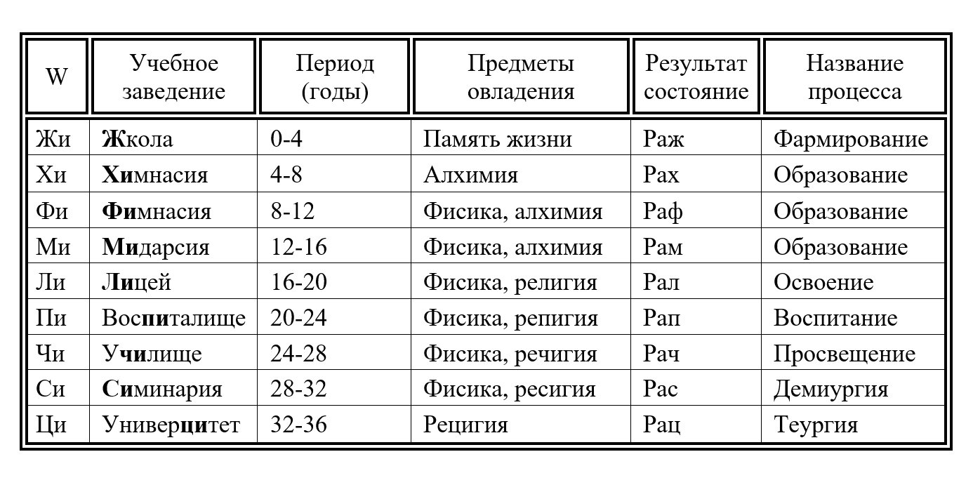 В древности назначение учебного заведения было помочь человеку превратить (образовать) соответствующую тонкую оболочку в тонкое тело. Соответственно программа в этих учебных заведения была направлена, прежде всего, не на усвоение каких-то полезных знаний, хотя это присутствовало тоже, но работу со своим тонким телом, которое надо было растить, питать, ухаживать за ним, чтобы оно сформировалось, выросло и стало идентичным физическому телу человеку. Именно поэтому захватчики Земли, прежде всего, реформировали систему просвещения (школу и колледж), уничтожили систему образования (химнасию, фимнасию, мидарсию), разрушили систему просвещения и воспитания (лицеи и воспиталища), просвещения и учёбу (училища). И уничтожили знания, получаемые нашими предками в семинарии и университете (универцитете), заменив их в большей степени бесполезным для жизни и общества умствованиями.